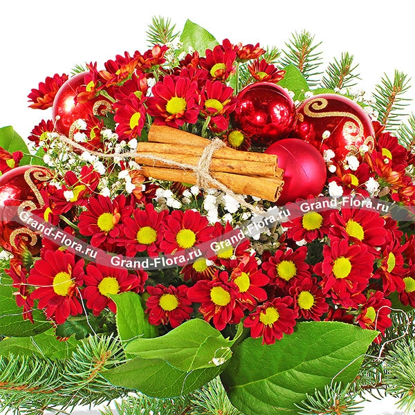 Стандартный (на фото): хризантема красная ромашковидная - 5шт., гипсофила - 4шт., еловая ветвь, корица, новогодний декор и зелень, сетка.