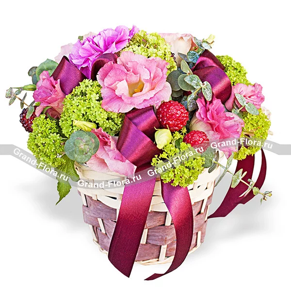 Стандартный: диантус розовый - 3 шт., эустома розовая -2 шт., эвкалипт, зелень, декор, оазис, корзина малая.