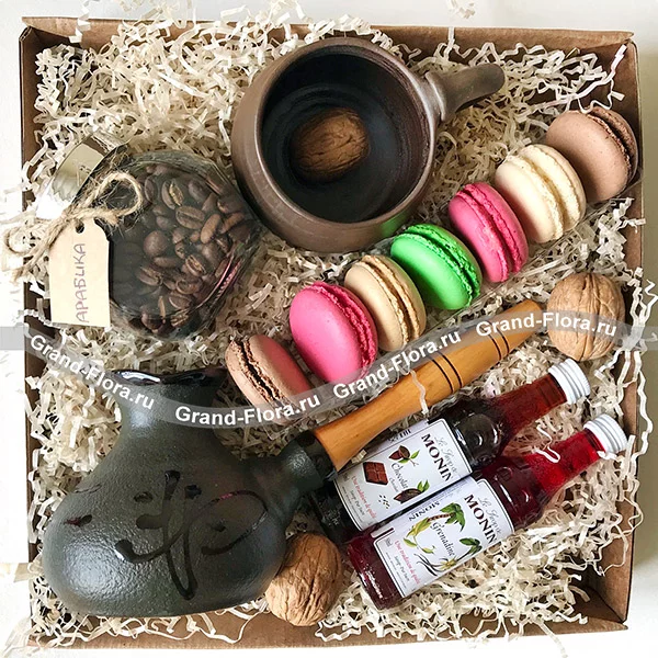 Стандартный: керамическая турка (200 мл) - 1 шт., керамическая кофейная кружка (250 мл) - 1 шт., кофе в зернах (100% арабика светлой обжарки) - 1 шт., сиропы для кофе – 2 шт., набор макарун - 1 уп., подарочная коробка, наполнитель, декор (грецкие орехи).