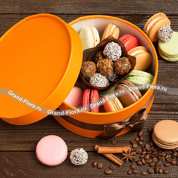 Стандартный: трюфели ассорти - 20 шт., макаронс ассорти - 20 шт., коробка.