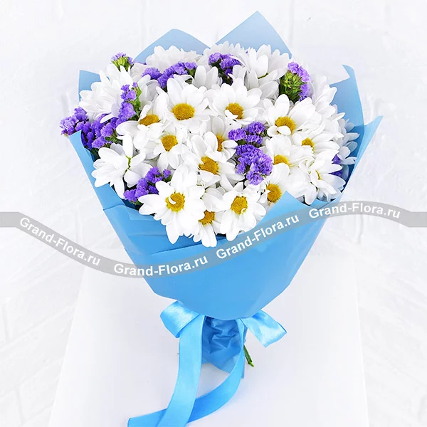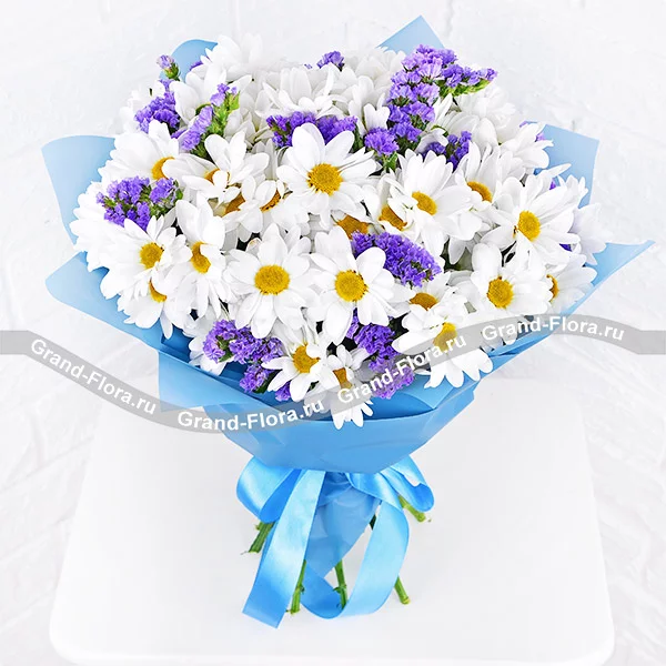 Стандартный (на фото): хризантема белая кустовая ромашковая - 7 ., статица - 3 шт., салал, фетр фиолетовый.